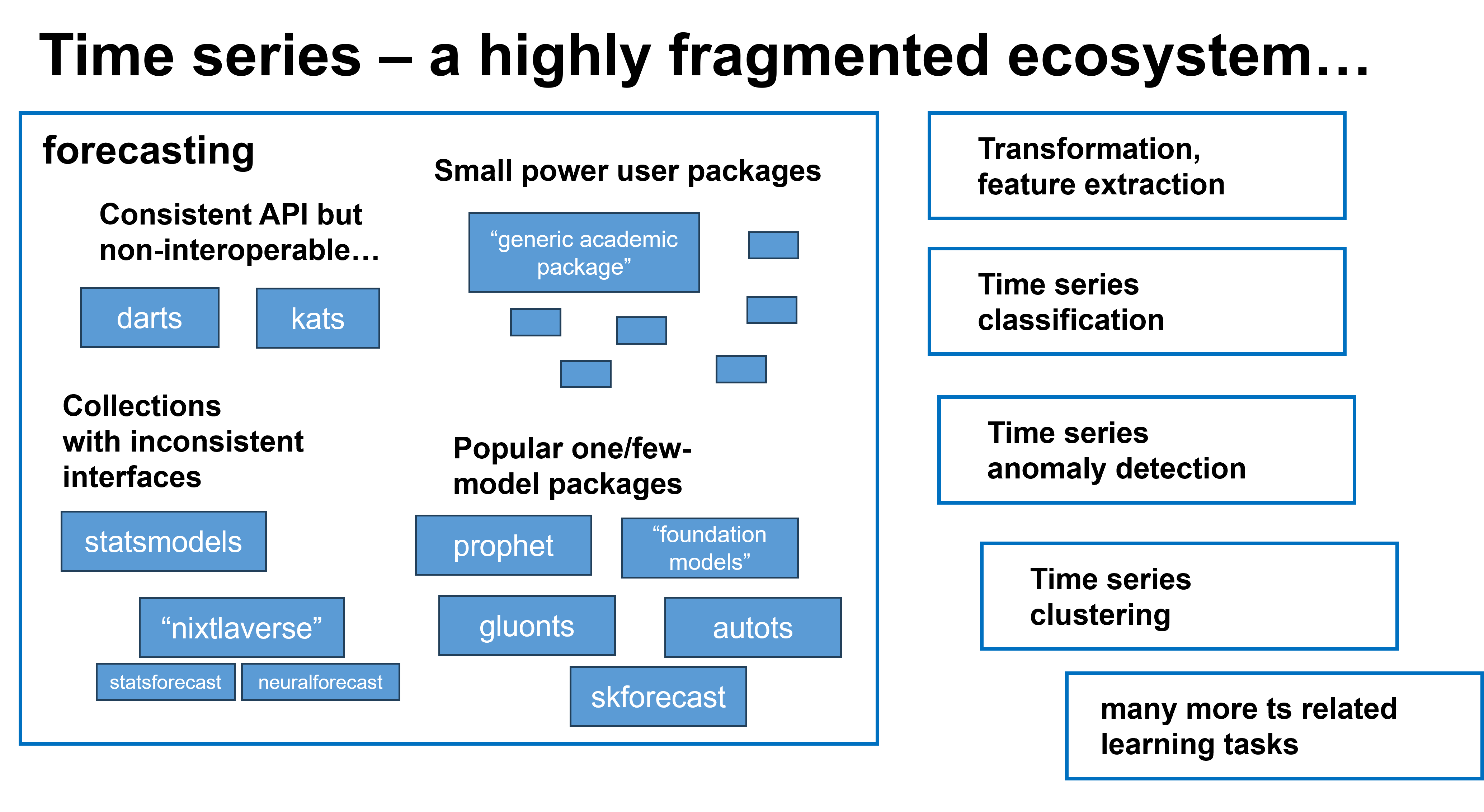 The package space for time series is highly fragmented, lots of great implementations and methods out there but many different interfaces. Most have very limited customizability.